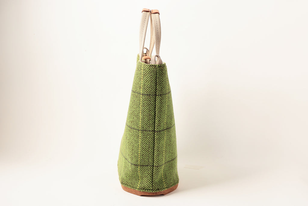 編み目の細かいヘリンボーンのライトグリーンの織りに、縦に明るいイエロー、横にブラウンのチェックが入った生地です。織り柄が美しく、新緑を思わせる明るいグリーンの生地です。